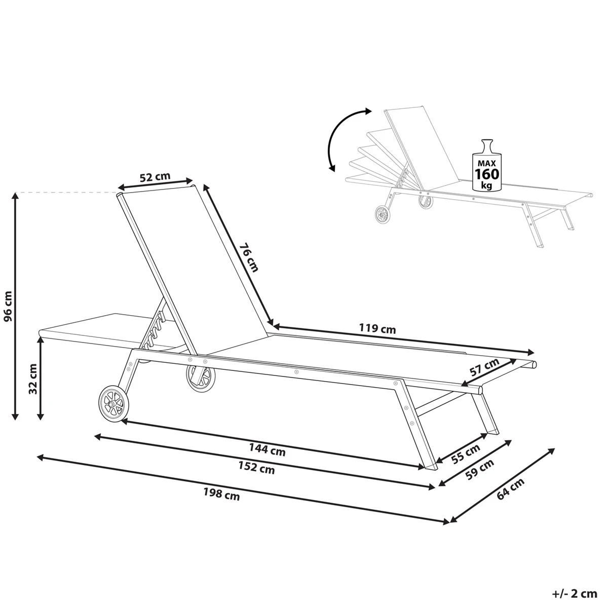 Belangrijkste eigenschappen: Rugleuning verstelbaar in 6 posities, Verrijdbare poten voor het eenvoudig verplaatsen, Zeer comfortabel, Modern terras- en tuinmeubilair, UV-bestendigheidsklasse, Beschermdoppen voor oppervlaktebescherming